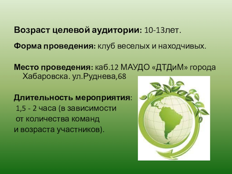 Оформление зала: плакаты воспитанников на экологическую тему, плакат с названием КВН « Наша земля – Хабаровский край»