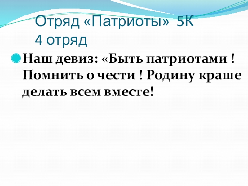 Отряд «Патриоты» 5К 4 отрядНаш девиз: «Быть патриотами ! Помнить о чести ! Родину краше делать всем