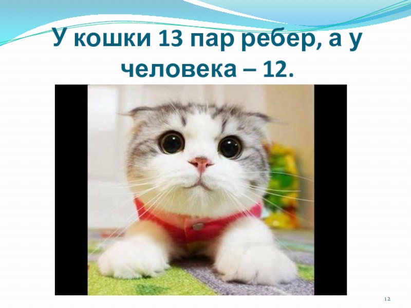 Слайд 12У кошки 13 пар ребер, а у человека – 12.