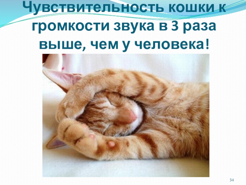 Слайд 34Чувствительность кошки к громкости звука в 3 раза выше, чем у