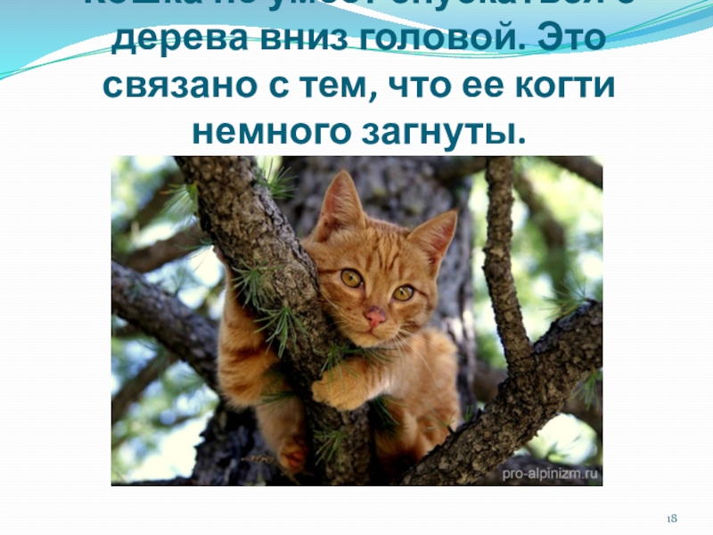 Слайд 18Кошка не умеет спускаться с дерева вниз головой. Это связано с