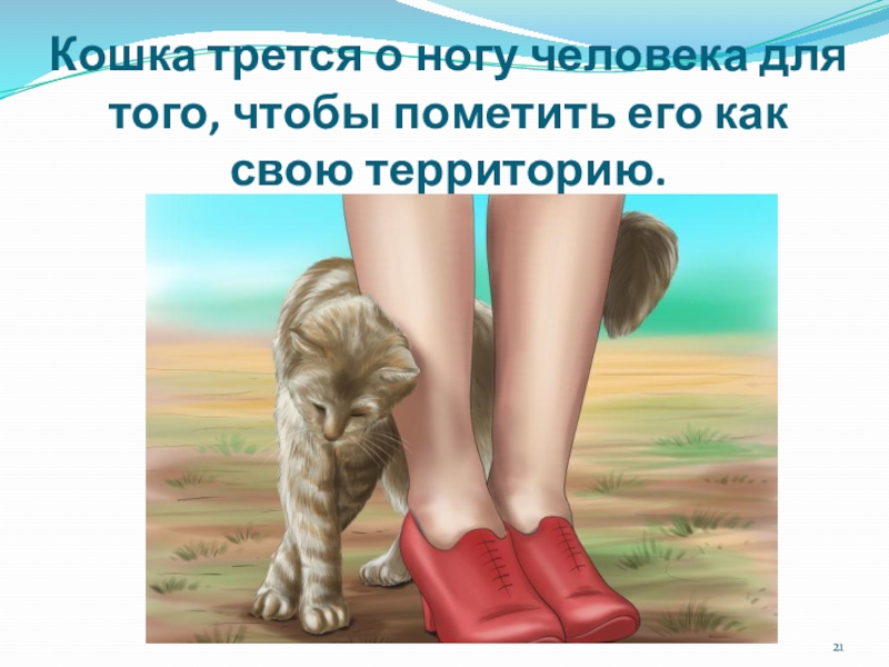 Слайд 21Кошка трется о ногу человека для того, чтобы пометить его как