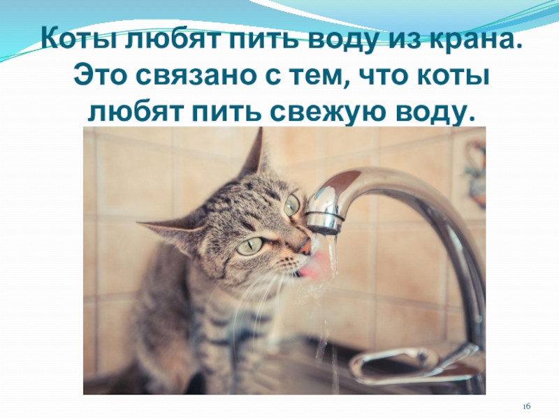 Слайд 16Коты любят пить воду из крана. Это связано с тем, что