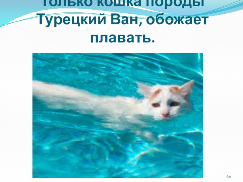 Слайд 60Только кошка породы Турецкий Ван, обожает плавать.
