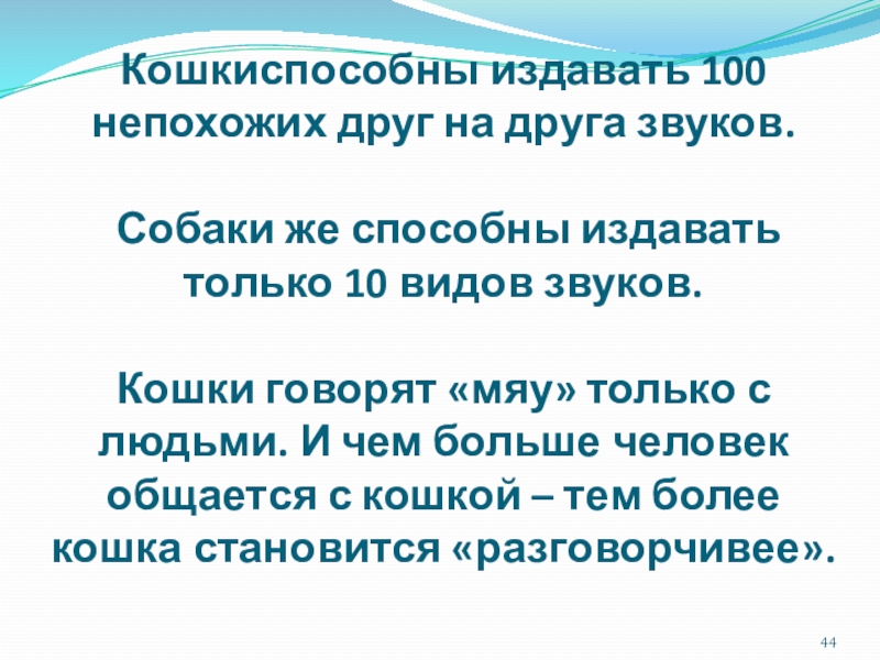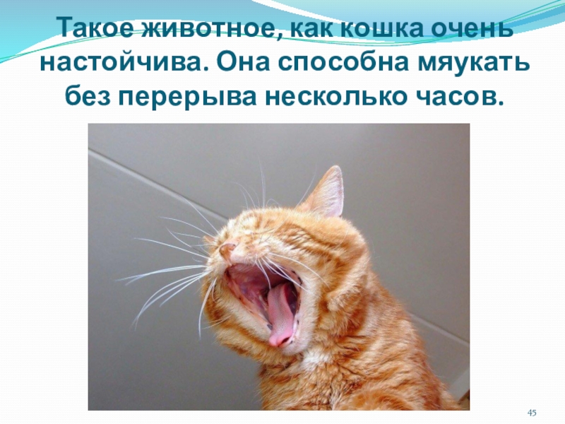 Слайд 45Такое животное, как кошка очень настойчива. Она способна мяукать без перерыва