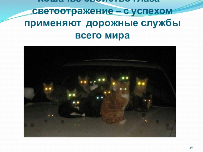 Слайд 46Кошачье свойство глаза – светоотражение – с успехом применяют дорожные службы