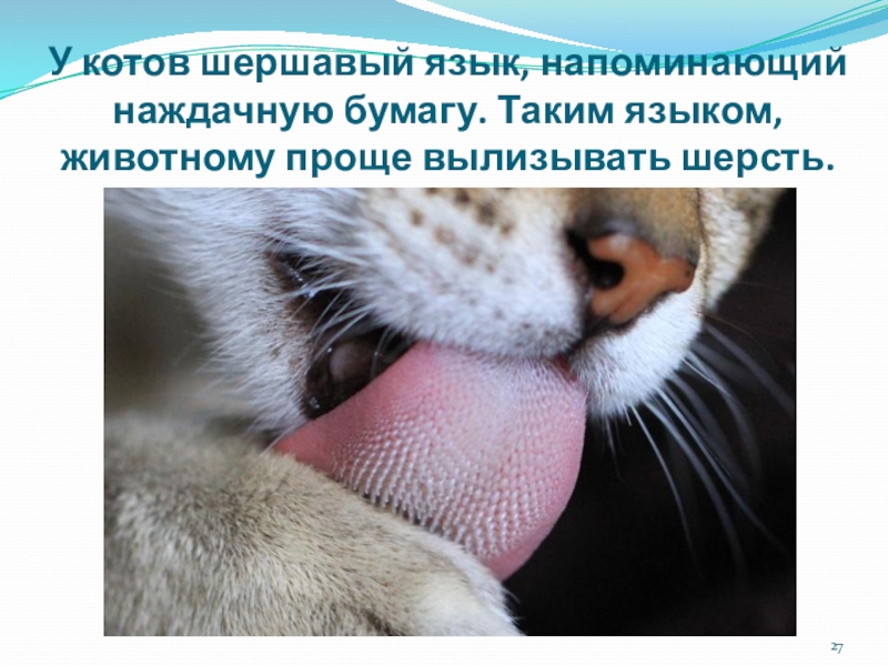 Слайд 27У котов шершавый язык, напоминающий наждачную бумагу. Таким языком, животному проще