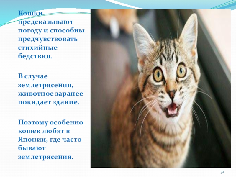 Слайд 32Кошки предсказывают погоду и способны предчувствовать стихийные бедствия.