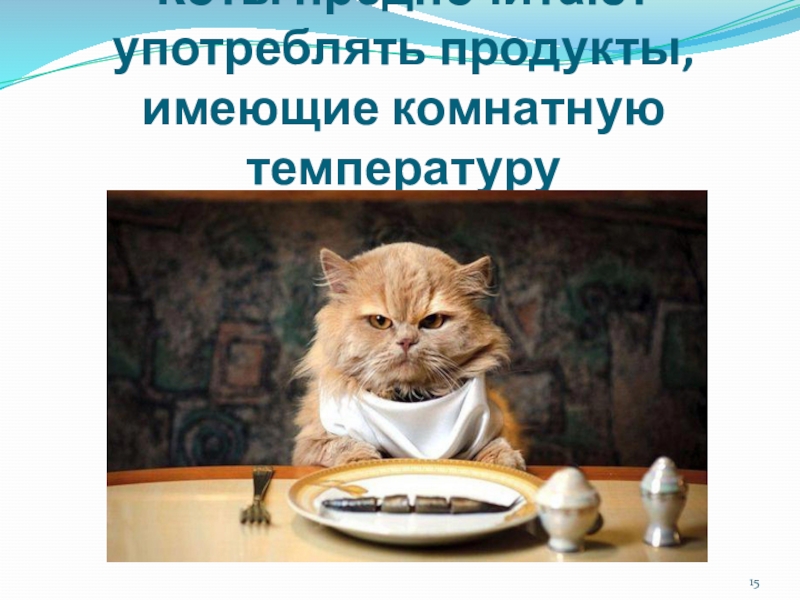 Слайд 15Коты предпочитают употреблять продукты, имеющие комнатную температуру