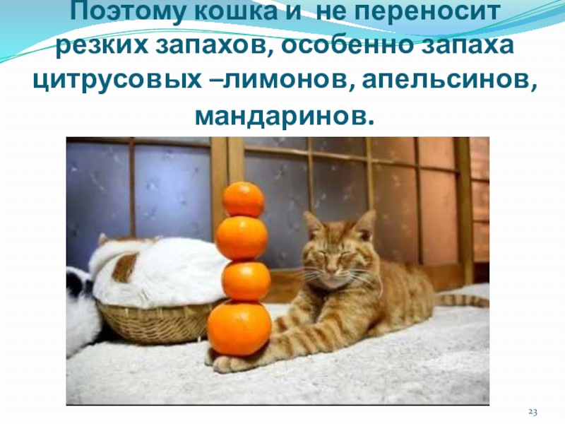 Слайд 23Поэтому кошка и не переносит резких запахов, особенно запаха цитрусовых –лимонов,