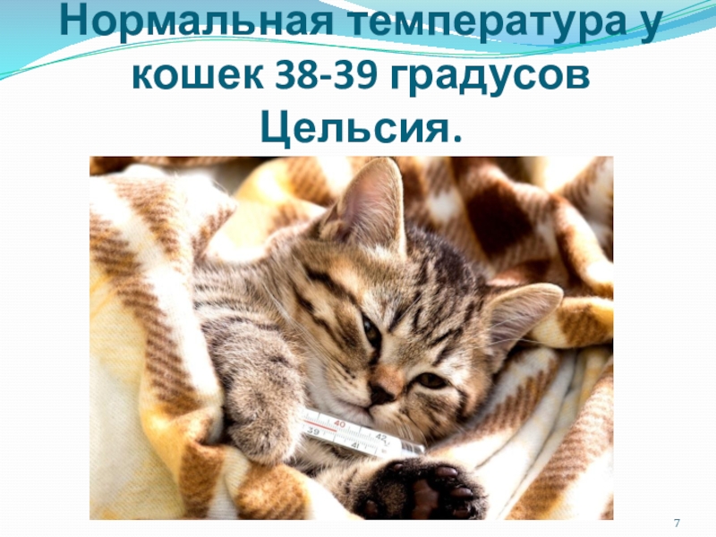 Слайд 7Нормальная температура у кошек 38-39 градусов Цельсия.