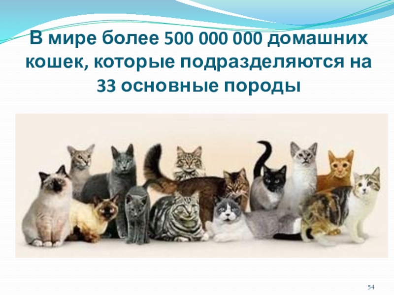 Слайд 54В мире более 500 000 000 домашних кошек, которые подразделяются на