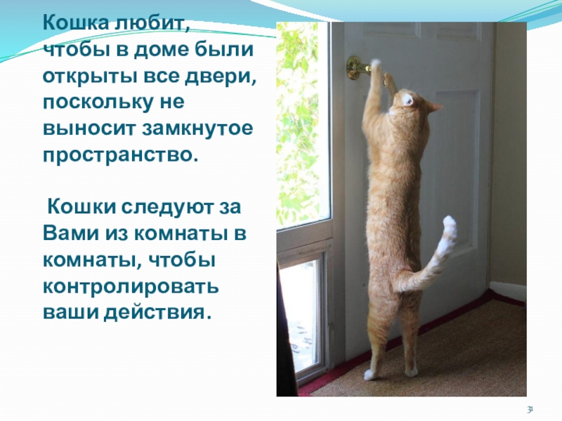 Слайд 31Кошка любит, чтобы в доме были открыты все двери, поскольку не