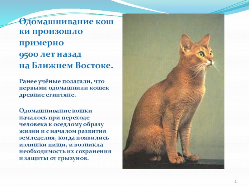 Одомашнивание кошки началось при переходе человека к оседлому образу жизни и с началом развития земледелия, когда появились излишки пищи, и возникла необходимость их сохранения и защиты от грызунов.