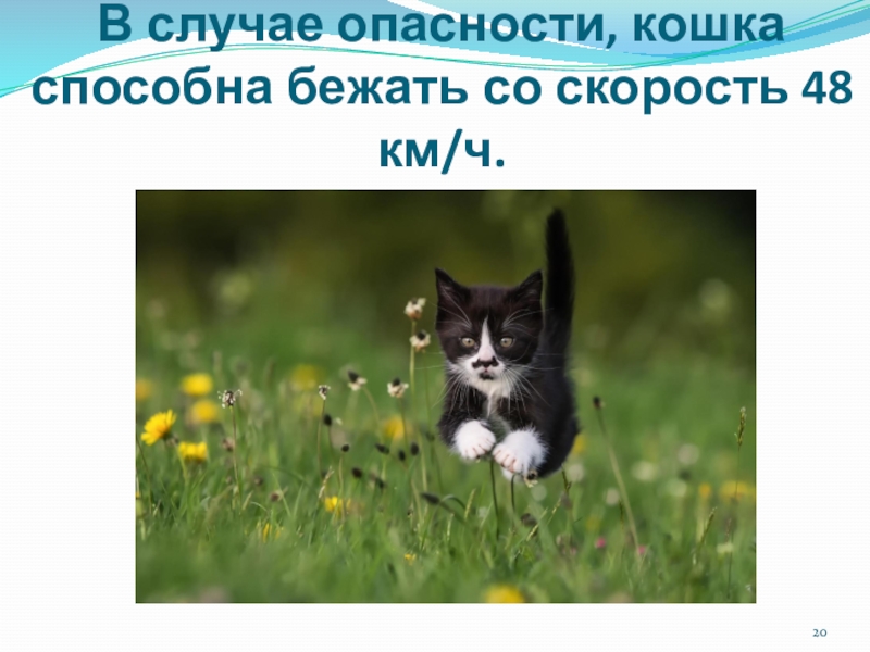 Слайд 20В случае опасности, кошка способна бежать со скорость 48 км/ч.