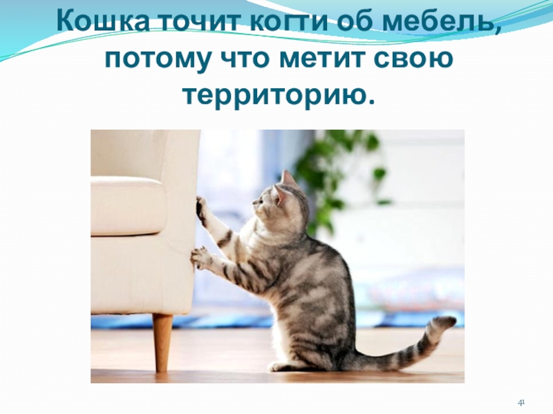 Слайд 41Кошка точит когти об мебель, потому что метит свою территорию.