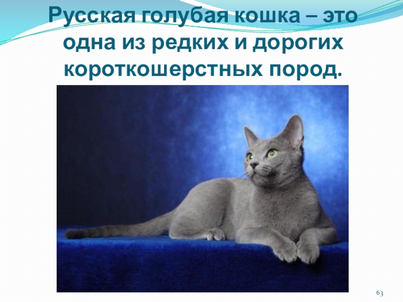 Слайд 63Русская голубая кошка – это одна из редких и дорогих короткошерстных