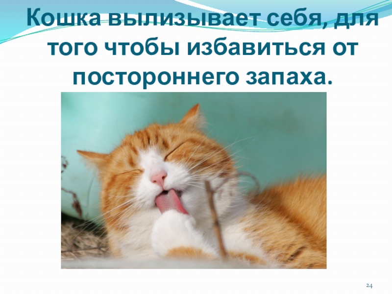 Слайд 24Кошка вылизывает себя, для того чтобы избавиться от постороннего запаха.
