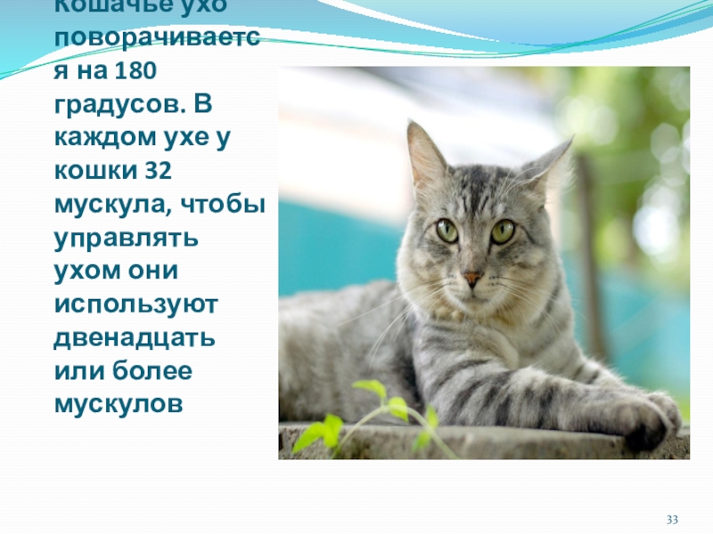 Слайд 33Кошачье ухо поворачивается на 180 градусов. В каждом ухе у кошки