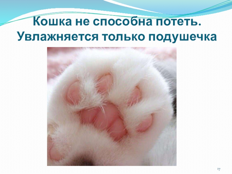 Слайд 17Кошка не способна потеть. Увлажняется только подушечка лапы.