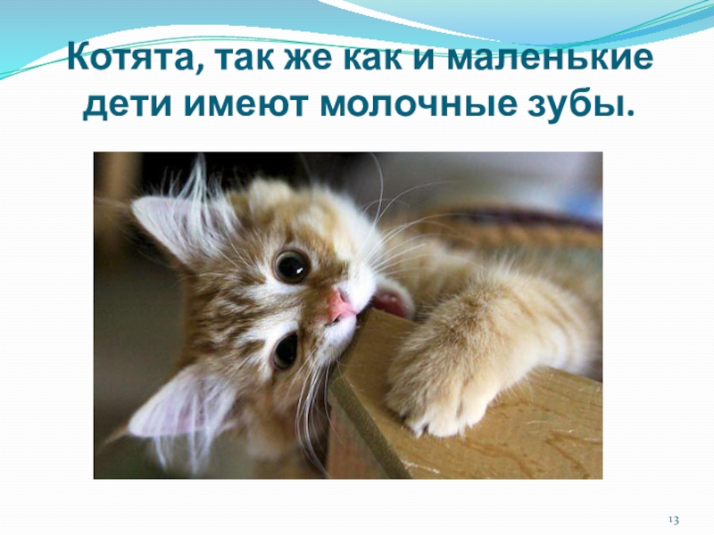 Слайд 13Котята, так же как и маленькие дети имеют молочные зубы.