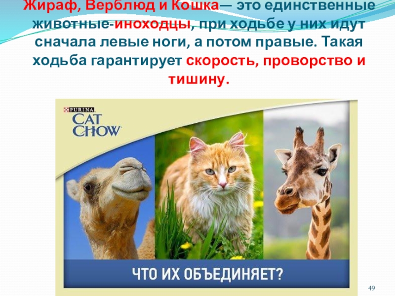 Слайд 49Жираф, Верблюд и Кошка— это единственные животные-иноходцы, при ходьбе у них