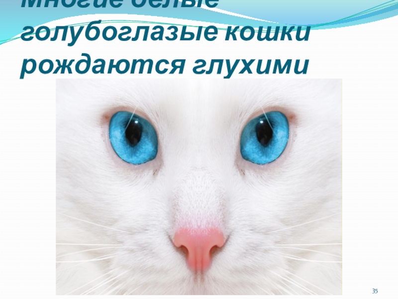 Слайд 35Многие белые голубоглазые кошки рождаются глухими