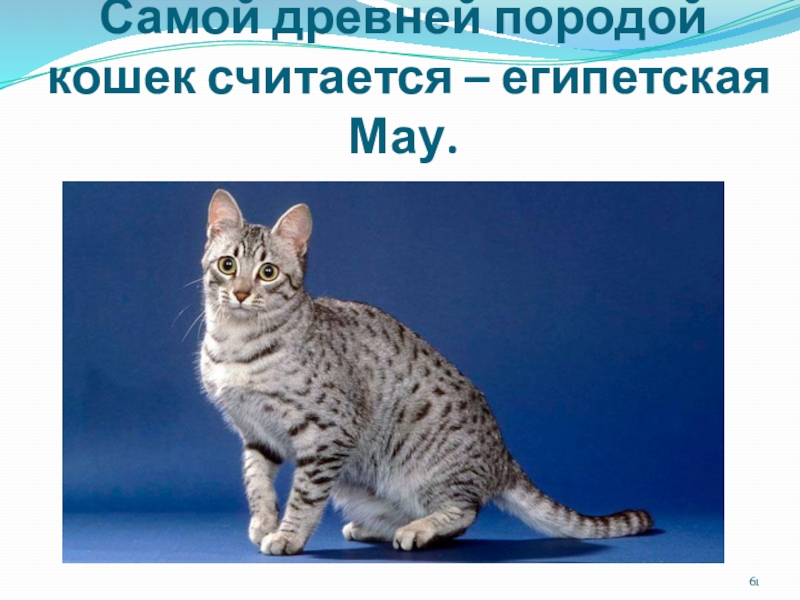 Слайд 61Самой древней породой кошек считается – египетская Мау.
