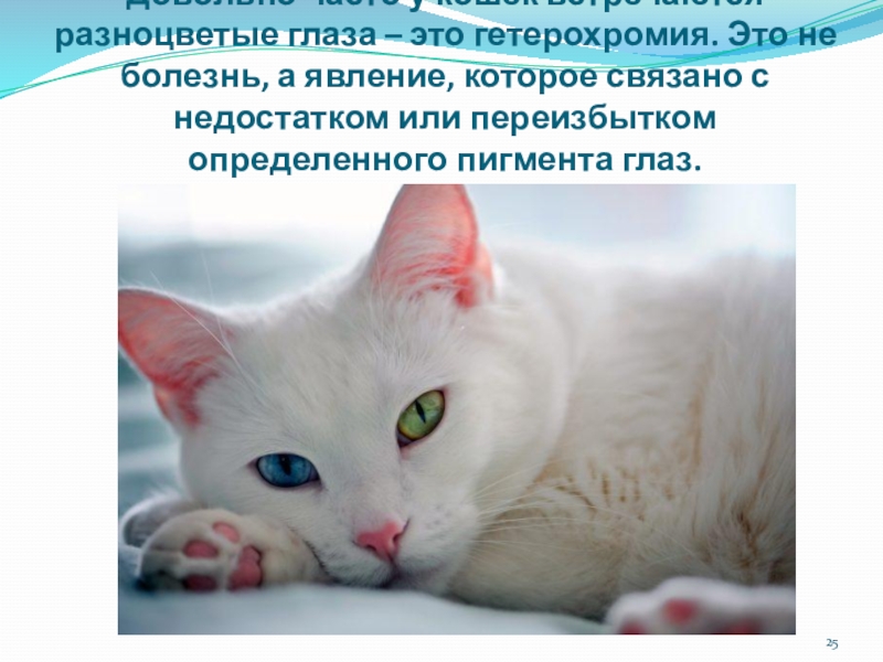 Слайд 25Довольно часто у кошек встречаются разноцветые глаза – это гетерохромия. Это