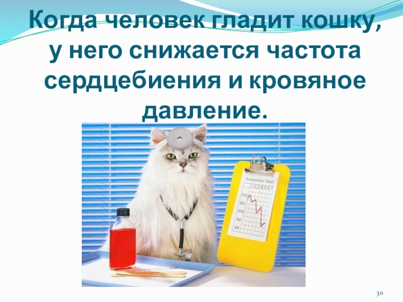 Слайд 30Когда человек гладит кошку, у него снижается частота сердцебиения и кровяное