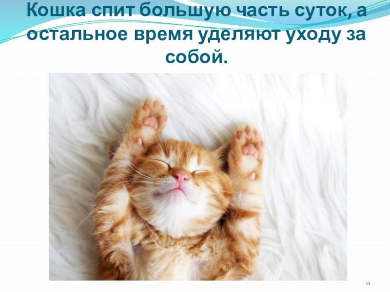Слайд 11Кошка спит большую часть суток, а остальное время уделяют уходу за