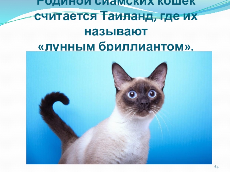 Слайд 64Родиной сиамских кошек считается Таиланд, где их называют