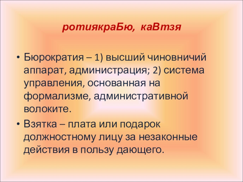 Коррупция – сращивание государственных структур со структурами преступного мира в сфере экономики, а также продажность и подкуп политических и общественных деятелей, государственных чиновников.