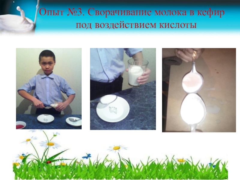 Слайд 11Опыт №3. Сворачивание молока в кефир под воздействием кислоты