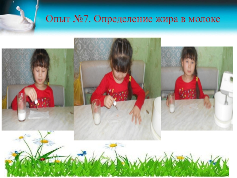 Слайд 15Опыт №7. Определение жира в молоке