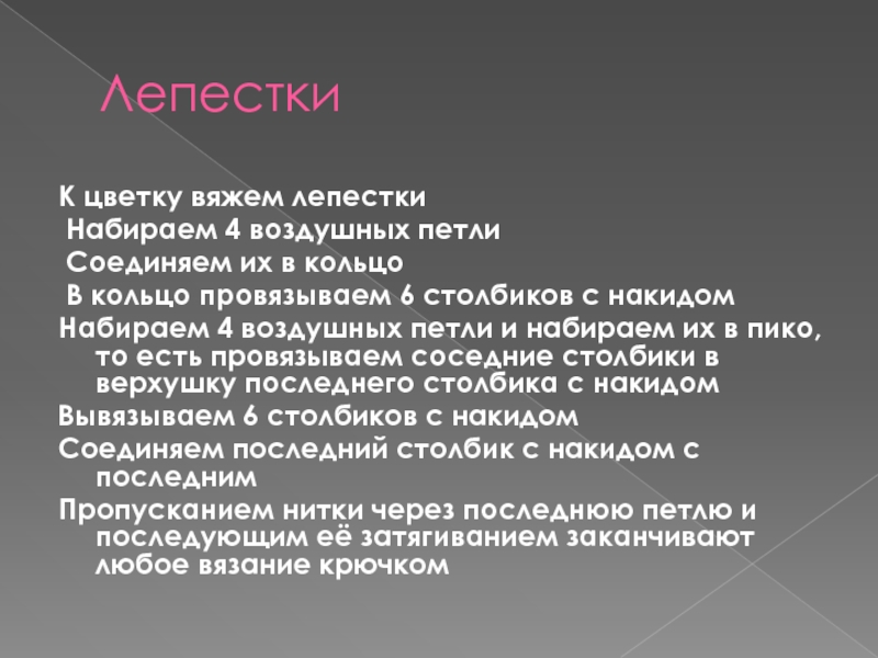Набираем 4 воздушных петли и набираем их в пико, то есть провязываем соседние столбики в верхушку последнего столбика с накидом