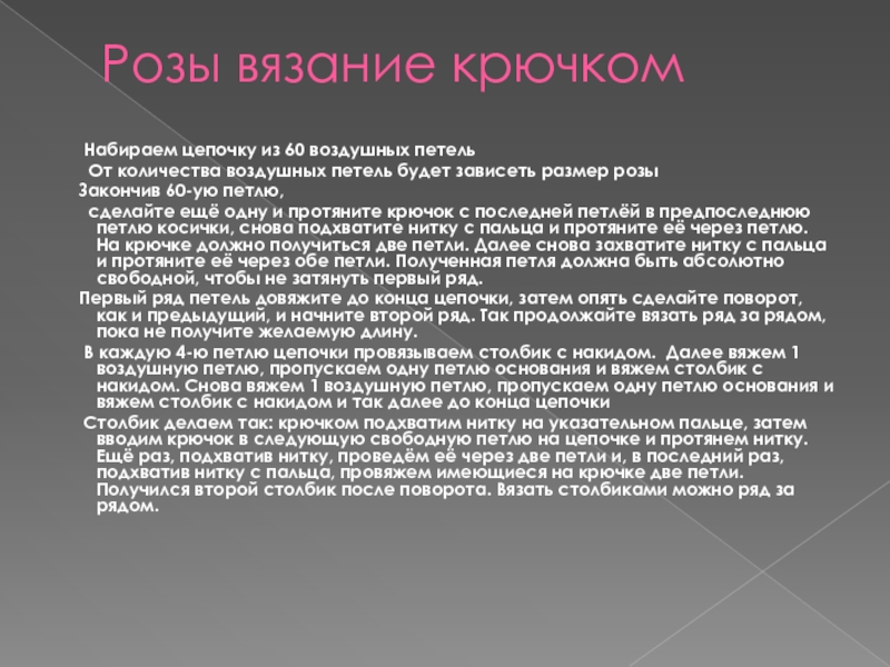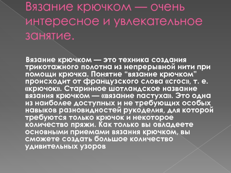 крючком — это техника создания трикотажного полотна из непрерывной нити при помощи крючка. Понятие “вязание крючком” происходит от французского слова «сгос», т. е. «крючок». Старинное шотландское название вязания крючком — «вязание пастуха». Это одна из наиболее доступных и не требующих особых навыков разновидностей рукоделия, для которой требуются только крючок и некоторое количество пряжи. Как только вы овладеете основными приемами вязания крючком, вы сможете создать большое количество удивительных узоров