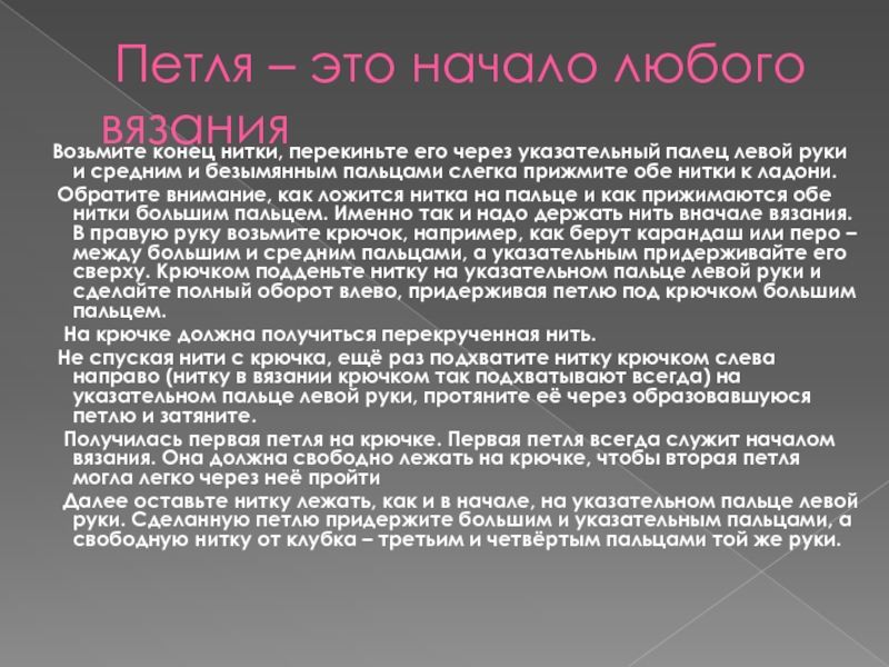 Обратите внимание, как ложится нитка на пальце и как прижимаются обе нитки большим пальцем. Именно так и надо держать нить вначале вязания. В правую руку возьмите крючок, например, как берут карандаш или перо – между большим и средним пальцами, а указательным придерживайте его сверху. Крючком подденьте нитку на указательном пальце левой руки и сделайте полный оборот влево, придерживая петлю под крючком большим пальцем.