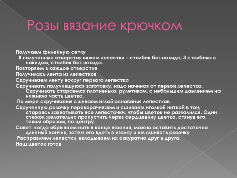 Совет: когда обрываем нить в конце вязания, можно оставить достаточно длинный кончик, затем его вдеть в иголку и им сшивать розочку