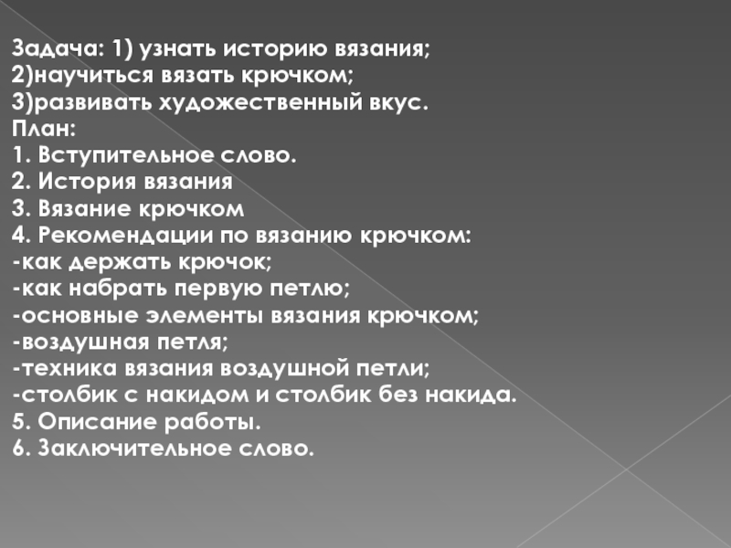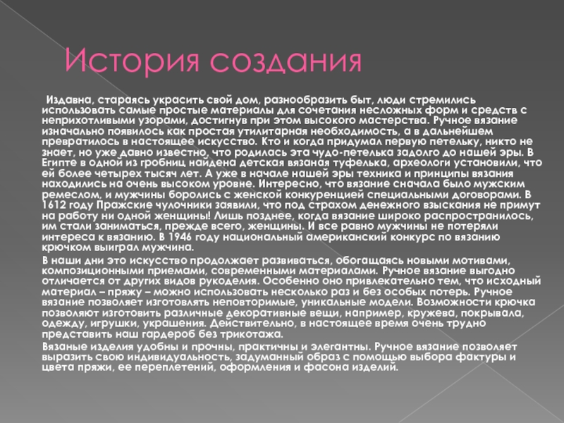 разнообразить быт, люди стремились использовать самые простые материалы для сочетания несложных форм и средств с неприхотливыми узорами, достигнув при этом высокого мастерства. Ручное вязание изначально появилось как простая утилитарная необходимость, а в дальнейшем превратилось в настоящее искусство. Кто и когда придумал первую петельку, никто не знает, но уже давно известно, что родилась эта чудо-петелька задолго до нашей эры. В Египте в одной из гробниц найдена детская вязаная туфелька, археологи установили, что ей более четырех тысяч лет. А уже в начале нашей эры техника и принципы вязания находились на очень высоком уровне. Интересно, что вязание сначала было мужским ремеслом, и мужчины боролись с женской конкуренцией специальными договорами. В 1612 году Пражские чулочники заявили, что под страхом денежного взыскания не примут на работу ни одной женщины! Лишь позднее, когда вязание широко распространилось, им стали заниматься, прежде всего, женщины. И все равно мужчины не потеряли интереса к вязанию. В 1946 году национальный американский конкурс по вязанию крючком выиграл мужчина.