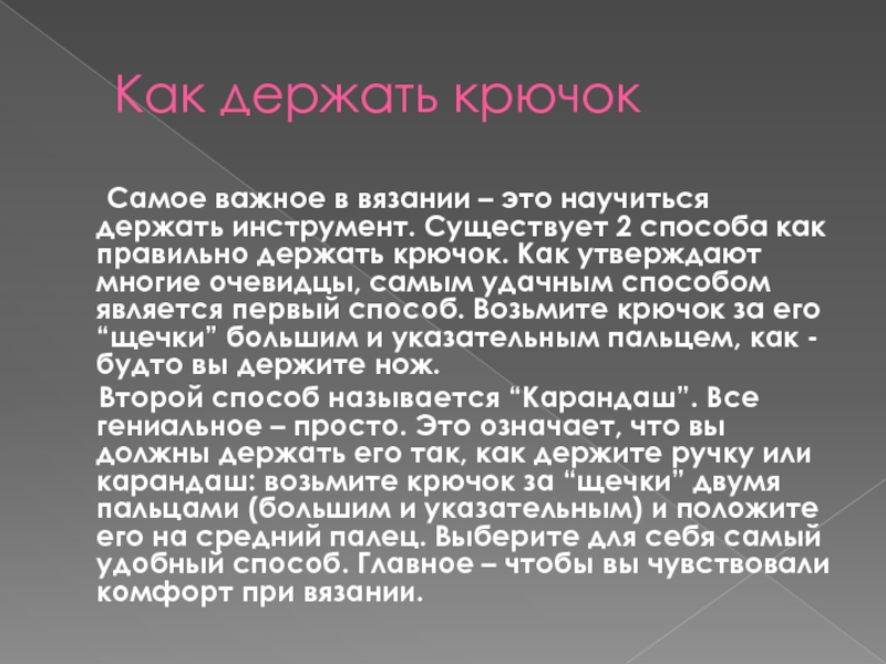 Второй способ называется “Карандаш”. Все гениальное – просто. Это означает, что вы должны держать его так, как держите ручку или карандаш: возьмите крючок за “щечки” двумя пальцами (большим и указательным) и положите его на средний палец. Выберите для себя самый удобный способ. Главное – чтобы вы чувствовали комфорт при вязании.