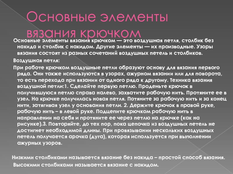 воздушная петля, столбик без накида и столбик с накидом. Другие элементы — их производные. Узоры вязания состоят из разных сочетаний воздушных петель и столбиков.
