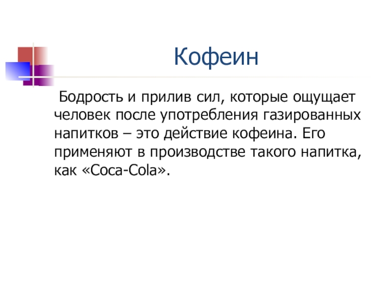 напитков – это действие кофеина. Его применяют в производстве такого напитка, как «Coca-Cola».