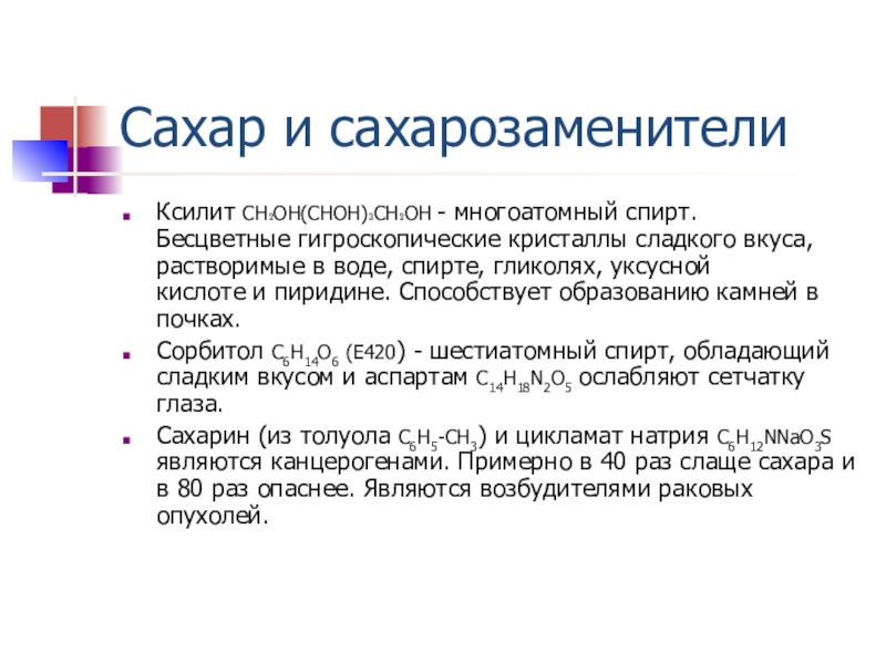 Ксилит CH₂OH(CHOH)₃CH₂OH - многоатомный спирт. Бесцветные гигроскопические кристаллы сладкого вкуса, растворимые в воде, спирте, гликолях, уксусной