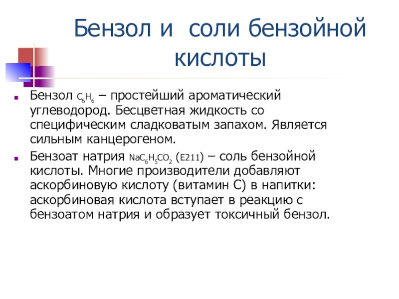 Бензоат натрия NaC6H5CO2 (Е211) – соль бензойной кислоты. Многие производители добавляют аскорбиновую кислоту (витамин С) в напитки: аскорбиновая кислота вступает в реакцию с бензоатом натрия и образует токсичный бензол.