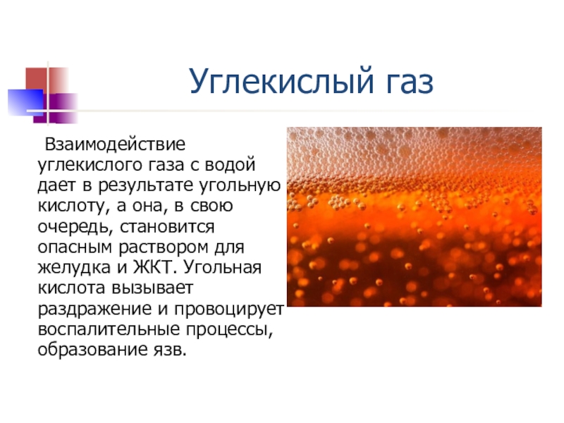 а она, в свою очередь, становится опасным раствором для желудка и ЖКТ. Угольная кислота вызывает раздражение и провоцирует воспалительные процессы, образование язв.