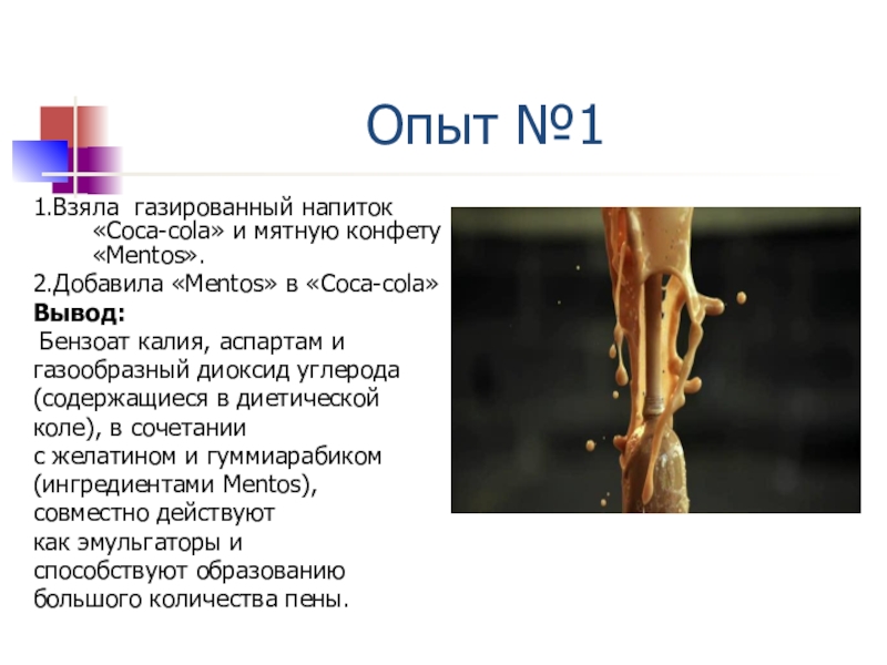 1.Взяла газированный напиток «Coca-cola» и мятную конфету «Mentos».