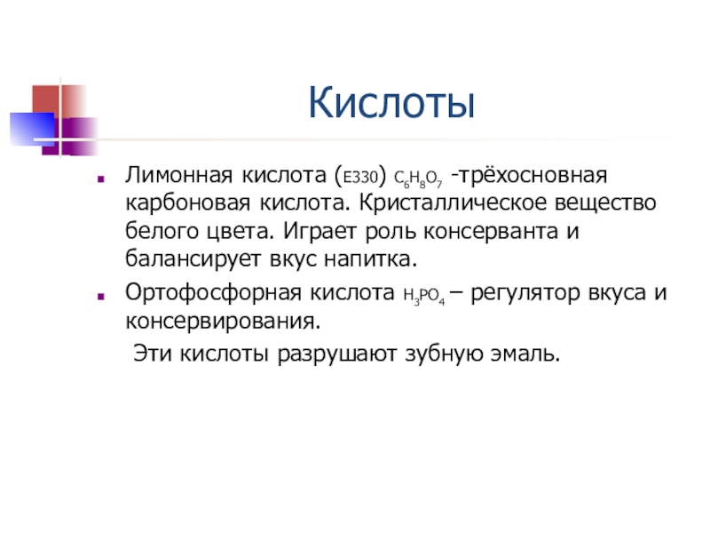 Ортофосфорная кислота Н3РО4 – регулятор вкуса и консервирования.