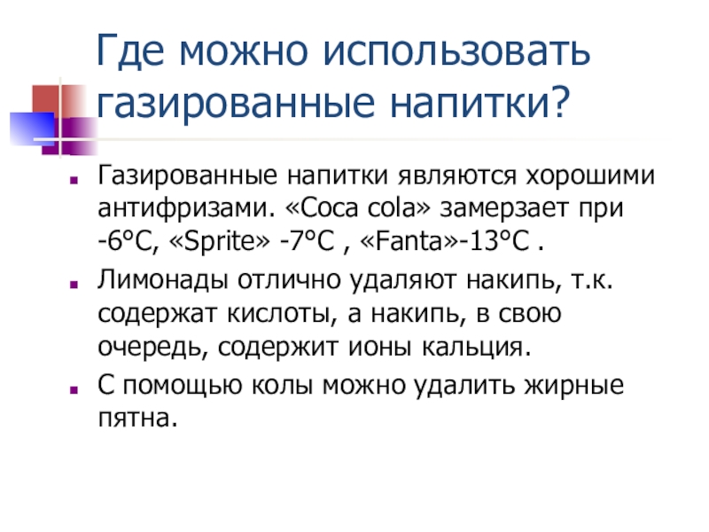 Слайд 20Где можно использовать газированные напитки?