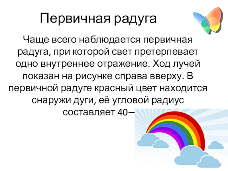 внутреннее отражение. Ход лучей показан на рисунке справа вверху. В первичной радуге красный цвет находится снаружи дуги, её угловой радиус составляет 40—42°.